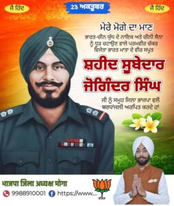 मोगा। देश की रक्षा के लिए प्राणों की आहुति देने वाले परमवीर चक्र विजेता सूबेदार जोगिंदर सिंह के शहीदी दिवस पर भारतीय जनता पार्टी के जिलाध्यक्ष डॉ. हरजोत कमल ने भावभीनी श्रद्धांजलि अर्पित की। उन्होंने कहा कि सूबेदार जोगिंदर सिंह न केवल मोगा जिले के, बल्कि पूरे देश के गौरव हैं, जिन्होंने मातृभूमि की रक्षा में अदम्य साहस, नेतृत्व क्षमता और वीरता का ऐसा परिचय दिया, जो सदैव अमर रहेगा।